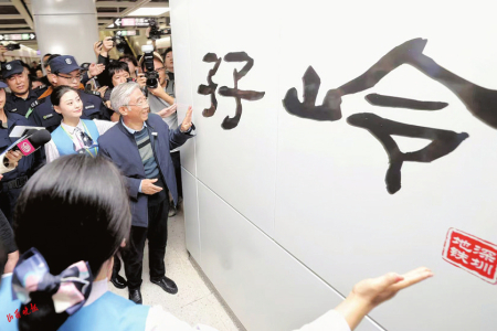 崗廈北站是深圳交通網(wǎng)絡(luò)中的重要節(jié)點(diǎn),設(shè)計(jì)獨(dú)具匠心,通過(guò)天井將陽(yáng)光引入地下,科技感和藝術(shù)性兼具,被譽(yù)為“深圳之眼”。在崗廈北站樞紐的“深圳之眼”下,姥爺即興揮毫,寫(xiě)下“情滿鵬城”“厚德載運(yùn),深鐵為民”。墨跡未干,照片已登上熱搜。
