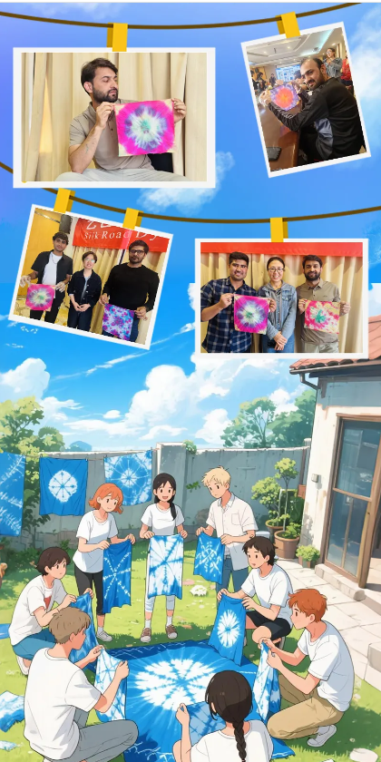 國際青年們認真聆聽扎染的歷史淵源與工藝精髓,并通過分步演示,親自體驗“絞纈”技法。留學(xué)生們在素色方巾上折疊、捆扎、浸染,創(chuàng)作出各具特色的紋樣。