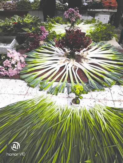 天剛蒙蒙亮,攀枝花市東區(qū)九附六菜市場(chǎng)里已經(jīng)人頭攢動(dòng),王美成將菜擺在攤位上,然后擺成各種形狀,再用鮮花裝扮一番,與他人的菜攤形成鮮明對(duì)比。