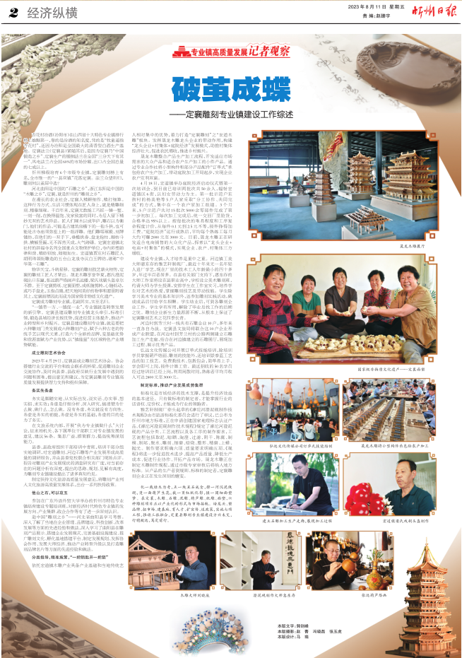 今年以來,定襄縣把雕刻專業(yè)鎮(zhèn)建設(shè)作為加快產(chǎn)業(yè)轉(zhuǎn)型升級(jí)、推進(jìn)市場主體倍增、發(fā)揮縣域特色優(yōu)勢、鍛造發(fā)展長板的重要抓手,充分發(fā)揮本縣雕刻產(chǎn)業(yè)的基礎(chǔ)優(yōu)勢和資源稟賦,培龍頭、塑品牌、拓市場、建基地、育人才、擴(kuò)宣傳、送政策,以特色專業(yè)鎮(zhèn)建設(shè)為高質(zhì)量發(fā)展注入新動(dòng)能。