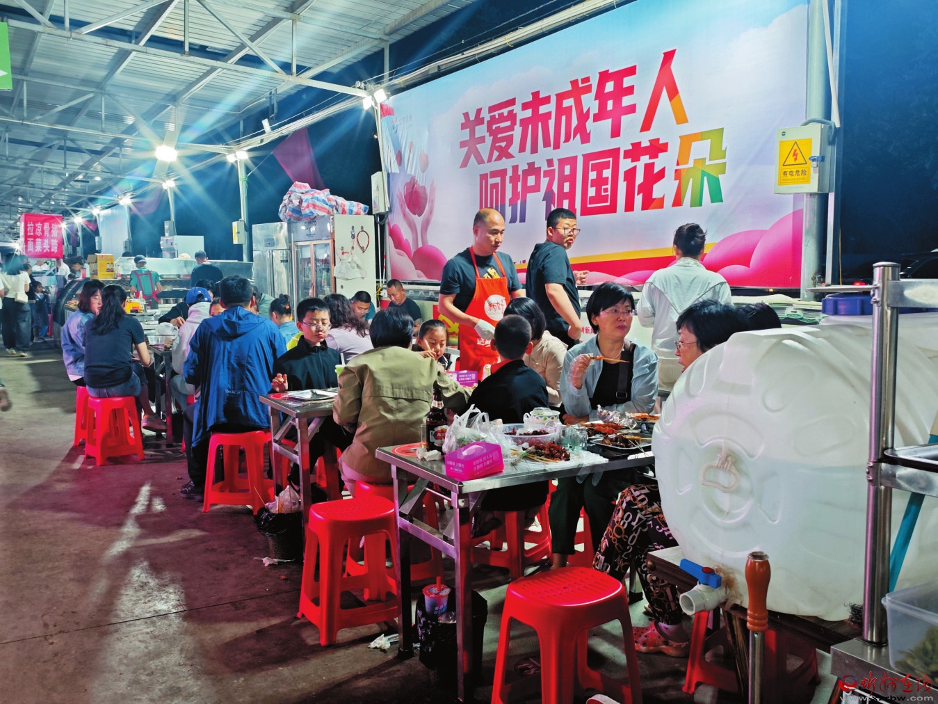 這場夜市盛宴里,“熱辣滾燙”的不僅是孫正偉的燒烤攤。馬大姐臭豆腐攤前總有來來往往的食客等待,已是兩鬢花白的徐師傅則以色香味俱全的炸串贏得客人稱贊;戴眼鏡的小哥也不甘寂寞,鐵板魷魚在他的手中美味生香……在特色小吃美食的周圍是慕名而來的市民,他們或三五好友小坐,或游走品嘗,共同交織成夏夜里最動人的“煙火氣”。“夜市不僅為我們提供了一個方便品嘗各種美食的生活圈子,更重要的是讓我們感受到了城市的‘煙火氣’,生活得更加放松、更加自在。”夜市愛好者王強如是坦言。