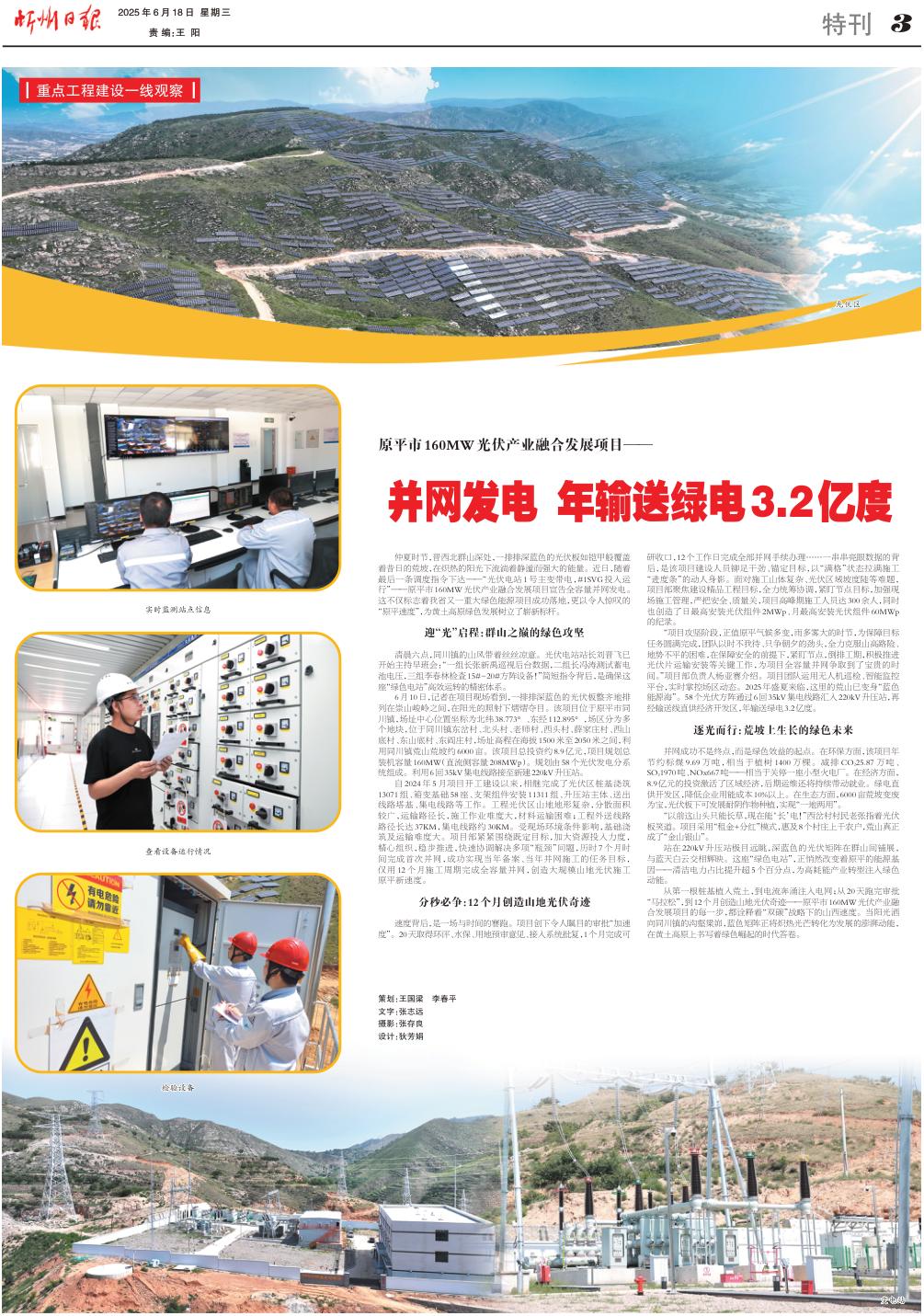 仲夏時節(jié),晉西北群山深處,一排排深藍色的光伏板如鎧甲般覆蓋著昔日的荒坡,在熾熱的陽光下流淌著靜謐而強大的能量。近日,隨著最后一條調(diào)度指令下達——“光伏電站1號主變帶電,#1SVG投入運行”——原平市160MW光伏產(chǎn)業(yè)融合發(fā)展項目宣告全容量并網(wǎng)發(fā)電。這不僅標志著我省又一重大綠色能源項目成功落地,更以令人驚嘆的“原平速度”,為黃土高原綠色發(fā)展樹立了嶄新標桿。