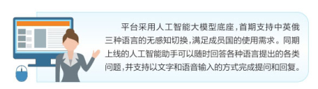 該平臺(tái)采用人工智能大模型底座,首期支持中英俄三種語(yǔ)言的無(wú)感知切換,滿足成員國(guó)的使用需求。同期上線的人工智能助手可以隨時(shí)回答各種語(yǔ)言提出的各類問(wèn)題,并支持以文字和語(yǔ)音輸入的方式完成提問(wèn)和回復(fù)。二期平臺(tái)更新后,將實(shí)現(xiàn)產(chǎn)業(yè)標(biāo)簽、企業(yè)和產(chǎn)品的自動(dòng)推薦功能,人工智能在用戶注冊(cè)后,可為用戶自動(dòng)生成和匹配目標(biāo)企業(yè)與目標(biāo)產(chǎn)品,優(yōu)化用戶體驗(yàn)。