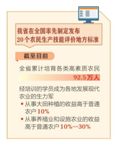 2014年開展農(nóng)民教育培訓(xùn)工作以來,我省各級(jí)農(nóng)業(yè)農(nóng)村部門圍繞全面支撐糧食安全和重要農(nóng)產(chǎn)品穩(wěn)定供給,統(tǒng)籌推進(jìn)農(nóng)業(yè)經(jīng)理人、農(nóng)村創(chuàng)新創(chuàng)業(yè)者、鄉(xiāng)村治理及農(nóng)村社會(huì)事業(yè)發(fā)展帶頭人和種養(yǎng)加能手等六大類開展培訓(xùn),為推進(jìn)鄉(xiāng)村全面振興提供了有力人才保障。我省還在全國率先制定發(fā)布20個(gè)農(nóng)民生產(chǎn)技能評(píng)價(jià)地方標(biāo)準(zhǔn),建立了涵蓋主要農(nóng)作物種植品種和畜禽養(yǎng)殖品種的技能評(píng)價(jià)標(biāo)準(zhǔn)體系。截至目前,全省累計(jì)培育各類高素質(zhì)農(nóng)民92.5萬人,高素質(zhì)農(nóng)民培育績效考核持續(xù)排在全國優(yōu)秀行列。經(jīng)培訓(xùn)的學(xué)員活躍在農(nóng)業(yè)生產(chǎn)經(jīng)營各領(lǐng)域,成為各地發(fā)展現(xiàn)代農(nóng)業(yè)的生力軍,從事大田種植的收益高于普通農(nóng)戶10%,從事養(yǎng)殖業(yè)和設(shè)施農(nóng)業(yè)的收益高于普通農(nóng)戶10%—30%。