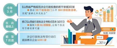 建立執(zhí)法清單,規(guī)范執(zhí)法行為。今年3月,省政府辦公廳印發(fā)《山西省嚴(yán)格規(guī)范涉企行政檢查的若干舉措》,推動(dòng)38個(gè)省級(jí)部門(mén)公開(kāi)380項(xiàng)檢查清單,實(shí)現(xiàn)“清單之外無(wú)權(quán)力”。同時(shí),省司法廳推動(dòng)各級(jí)行政執(zhí)法部門(mén)制定并公布年度行政檢查工作計(jì)劃,合理確定本單位對(duì)同一企業(yè)實(shí)施行政檢查的年度頻次上限,以及行政執(zhí)法部門(mén)的職責(zé)邊界。目前,已有21個(gè)省級(jí)行政檢查主體公布了行政檢查年度頻次上限,全省上半年涉企檢查總量同比下降36%。在此基礎(chǔ)上,修訂《山西省行政執(zhí)法文書(shū)格式范本(試行)》,編制4類46項(xiàng)模板,讓每個(gè)執(zhí)法環(huán)節(jié)都有章可循,進(jìn)一步規(guī)范執(zhí)法行為。