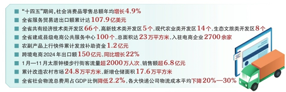 數字顯示,“十四五”期間,社會消費品零售總額年均增長4.9%,建成100個鄉(xiāng)村e鎮(zhèn),打造了大同黃花等113個區(qū)域公用品牌。農產品上行快件補助帶動約33億元農產品銷售。實物商品網上零售額年均增長24.1%,高于全國17.1個百分點。