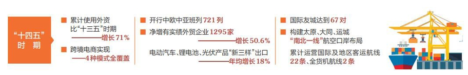 “十四五”時(shí)期,山西對(duì)外開(kāi)放的步伐堅(jiān)實(shí)有力。建立對(duì)外開(kāi)放“1+N”政策體系,全省累計(jì)使用外資比“十三五”時(shí)期增長(zhǎng)71%。服務(wù)貿(mào)易進(jìn)出口額累計(jì)達(dá)107.9億美元。外貿(mào)朋友圈拓展至158個(gè)國(guó)家和地區(qū)。外貿(mào)結(jié)構(gòu)進(jìn)一步優(yōu)化,全省凈增有實(shí)績(jī)外貿(mào)企業(yè)1295家、增長(zhǎng)50.6%,電動(dòng)汽車、鋰電池、光伏產(chǎn)品“新三樣”出口年均增長(zhǎng)18%??缇畴娚虒?shí)現(xiàn)4種模式全覆蓋。中歐中亞班列汽笛長(zhǎng)鳴,過(guò)去五年,開(kāi)行中歐中亞班列721列,一條條鋼鐵巨龍馱著山西的玻璃器皿、大型機(jī)械,通達(dá)亞歐17個(gè)國(guó)家、48個(gè)城市,讓“山西制造”與全球市場(chǎng)實(shí)現(xiàn)雙向奔赴。太重集團(tuán)生產(chǎn)的輪軸產(chǎn)品,憑借過(guò)硬質(zhì)量,已遠(yuǎn)銷全球60余個(gè)國(guó)家和地區(qū);山西建投的業(yè)務(wù)版圖,同樣延伸至全球60多個(gè)國(guó)家和地區(qū)。農(nóng)產(chǎn)品出口取得新突破,運(yùn)城多款果品“首發(fā)”多國(guó),大同黃花遠(yuǎn)渡重洋,藜麥粉首次擺上法國(guó)消費(fèi)者的餐桌。