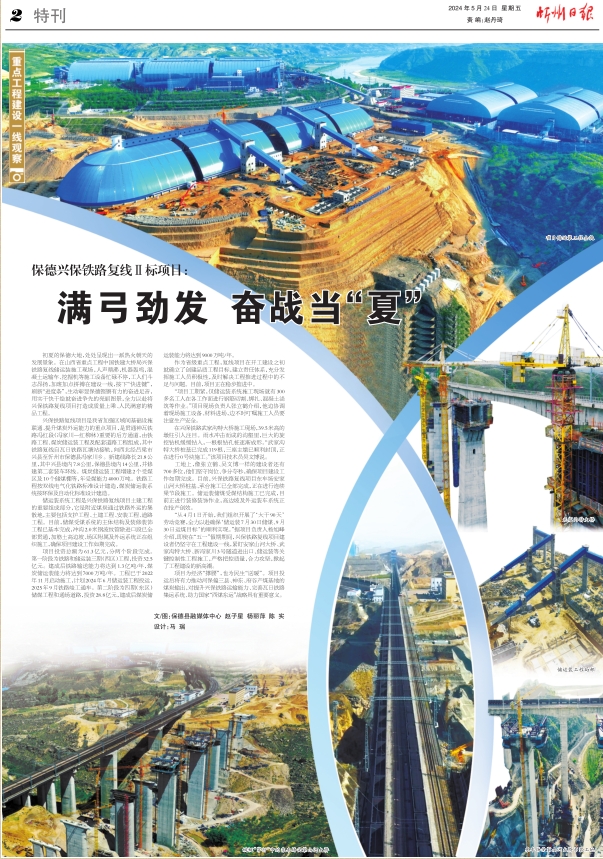 “從4月1日開始,我們組織開展了‘大干90天’勞動競賽,全力以赴確?!畠\裝7月30日儲煤、9月30日運煤目標’的順利實現(xiàn)?!睋?jù)項目負責人楊旭峰介紹,即使在“五一”假期期間,興保鐵路復線項目建設者仍堅守在工程建設一線,緊盯安家山河大橋、武家溝特大橋、新馮家川3號隧道進出口、儲運裝等關鍵控制性工程施工,嚴格把控質量,合力攻堅,掀起了工程建設的新高潮。