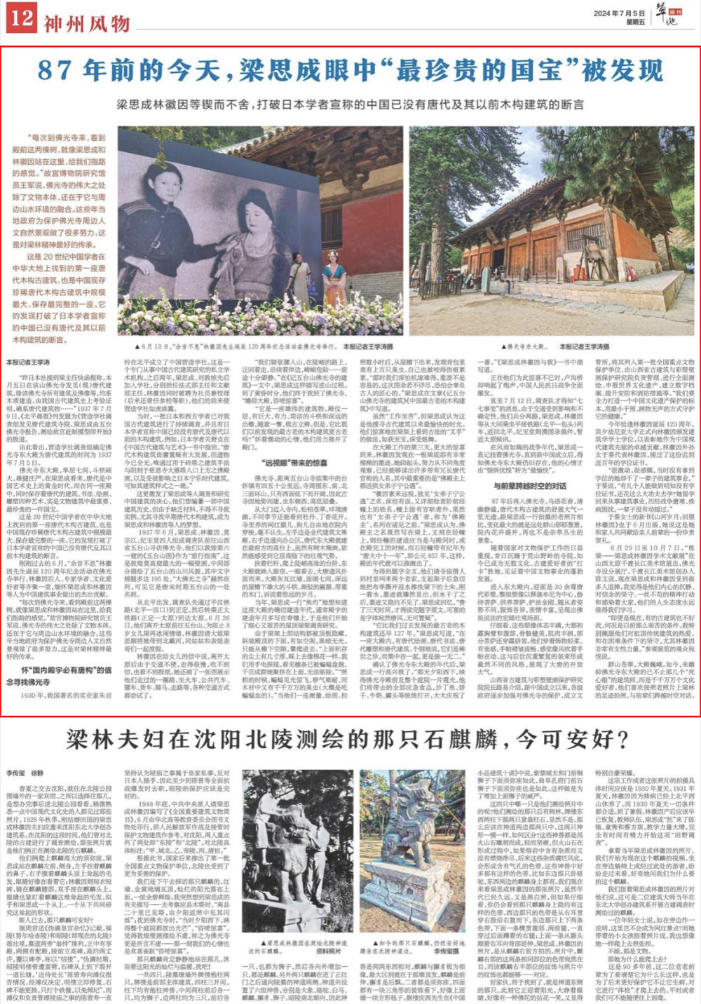 “昨日本社接到梁主任快函報稱,本月五日在該山佛光寺發(fā)見(現(xiàn))唐代建筑,緣該佛光寺所有建筑及佛像等,均系木質(zhì)建造,由我國古代建筑史上考驗證明,確系唐代建筑物……”1937年7月9日,《北平晨報》刊發(fā)題為《營造學(xué)社調(diào)查組發(fā)見唐代建筑寺院,梁思成由五臺佛光寺報告,測繪故宮趕制模型即開始》的報道。