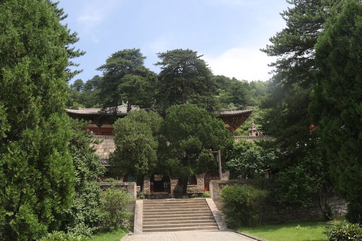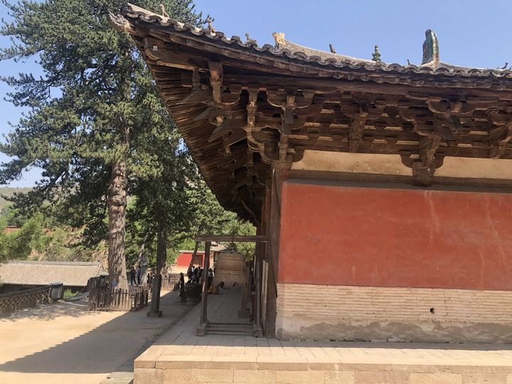從大門邁入寺內(nèi),松柏蒼翠,環(huán)境清幽,不同季節(jié)還能看到牡丹、丁香花開。寺里養(yǎng)的網(wǎng)紅貓兒、狗兒自由地在院內(nèi)穿梭,毫不認(rèn)生。左手邊是金代建筑文殊殿,右手邊通向辦公區(qū),唐代東大殿就建在最前方的高臺上,雖然有樹木掩映,依然能感受到它居高臨下的壯觀氣勢。
