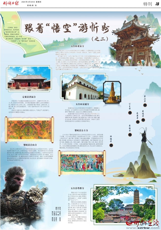 巖山寺,又稱靈巖寺,位于繁峙縣城東南45公里處的天巖村。全寺占地面積3580平方米,以精美的金代壁畫而著稱?,F(xiàn)存面積90平方米的壁畫內(nèi)容豐富、意蘊深邃,既是我國寺廟壁畫藝術的精品,又是研究宋金時代歷史、社會、宗教、美術的珍貴資料。壁畫繪畫手法多樣、技術精湛。巖山寺不僅壁畫堪稱一絕,雕塑也極具文物和藝術價值。佛壇上的觀音塑像和佛壇旁的護法力士塑像等形貌秀麗、體態(tài)優(yōu)美、威風凜凜,傳承唐代風格,是我國金代彩塑中的上品。