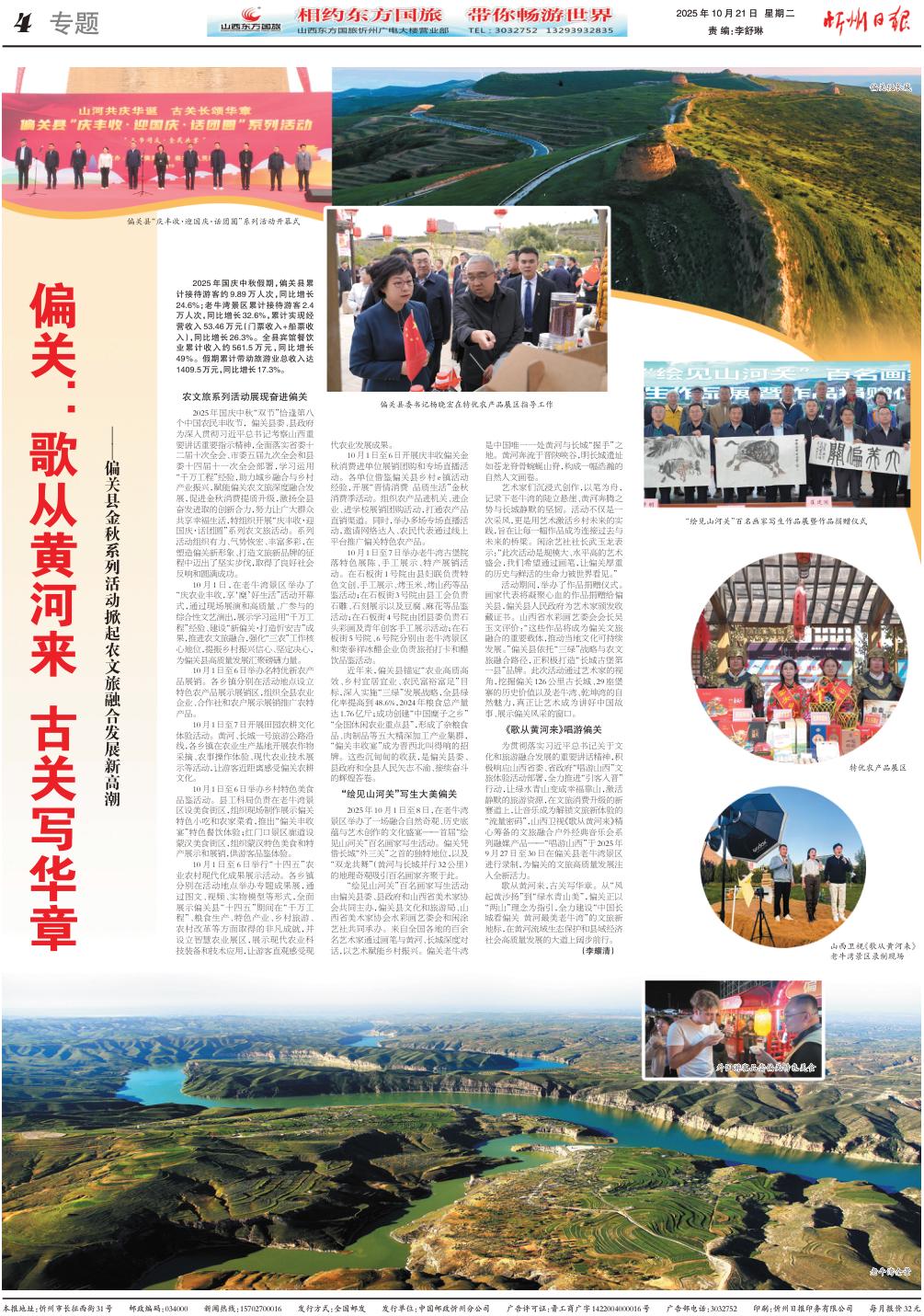 2025年國慶中秋“雙節(jié)”恰逢第八個(gè)中國農(nóng)民豐收節(jié),偏關(guān)縣委、縣政府為深入貫徹習(xí)近平總書記考察山西重要講話重要指示精神,全面落實(shí)省委十二屆十次全會(huì)、市委五屆九次全會(huì)和縣委十四屆十一次全會(huì)部署,學(xué)習(xí)運(yùn)用“千萬工程”經(jīng)驗(yàn),助力城鄉(xiāng)融合與鄉(xiāng)村產(chǎn)業(yè)振興,賦能偏關(guān)農(nóng)文旅深度融合發(fā)展,促進(jìn)金秋消費(fèi)提質(zhì)升級,激揚(yáng)全縣奮發(fā)進(jìn)取的創(chuàng)新合力,努力讓廣大群眾共享幸福生活,特組織開展“慶豐收·迎國慶·話團(tuán)圓”系列農(nóng)文旅活動(dòng)。系列活動(dòng)組織有力、氣勢恢宏、豐富多彩,在塑造偏關(guān)新形象、打造文旅新品牌的征程中邁出了堅(jiān)實(shí)步伐,取得了良好社會(huì)反響和圓滿成功。