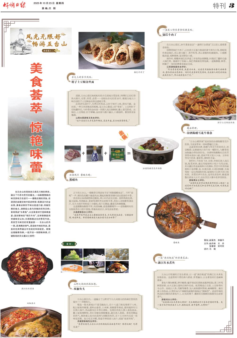 當(dāng)五臺(tái)山的清泉流云遇見川湘的奔放、融合了巧思與烹飪的魔法,一場(chǎng)顛覆想象的味覺游戲正在進(jìn)行——醬醋點(diǎn)睛的活魚,在滾燙的油醋交響中躍動(dòng)鮮甜;吸滿湯汁的金絲面,裹著鹵香肘子燜出勁道口感;雙椒狂想的魚頭,演奏起山泉與剁椒的熾熱交響;素齋菜品“水煮魚”,以全素食材打造麻辣盛宴;復(fù)刻葷味的“鍋巴牛肉”,在鮮香酥脆間突破味覺認(rèn)知;汾酒陳醋點(diǎn)化的雪花牛肋,是技藝與味覺的雙重盛宴……五臺(tái)山的另一面,是沸騰的鍋氣,是滋啦作響的熱油,是食材在跨界融合中完成的華麗蛻變。跟隨這縷酸香熱辣,一起開啟一場(chǎng)酣暢淋漓、打破陳規(guī)的舌尖魔幻之旅吧!