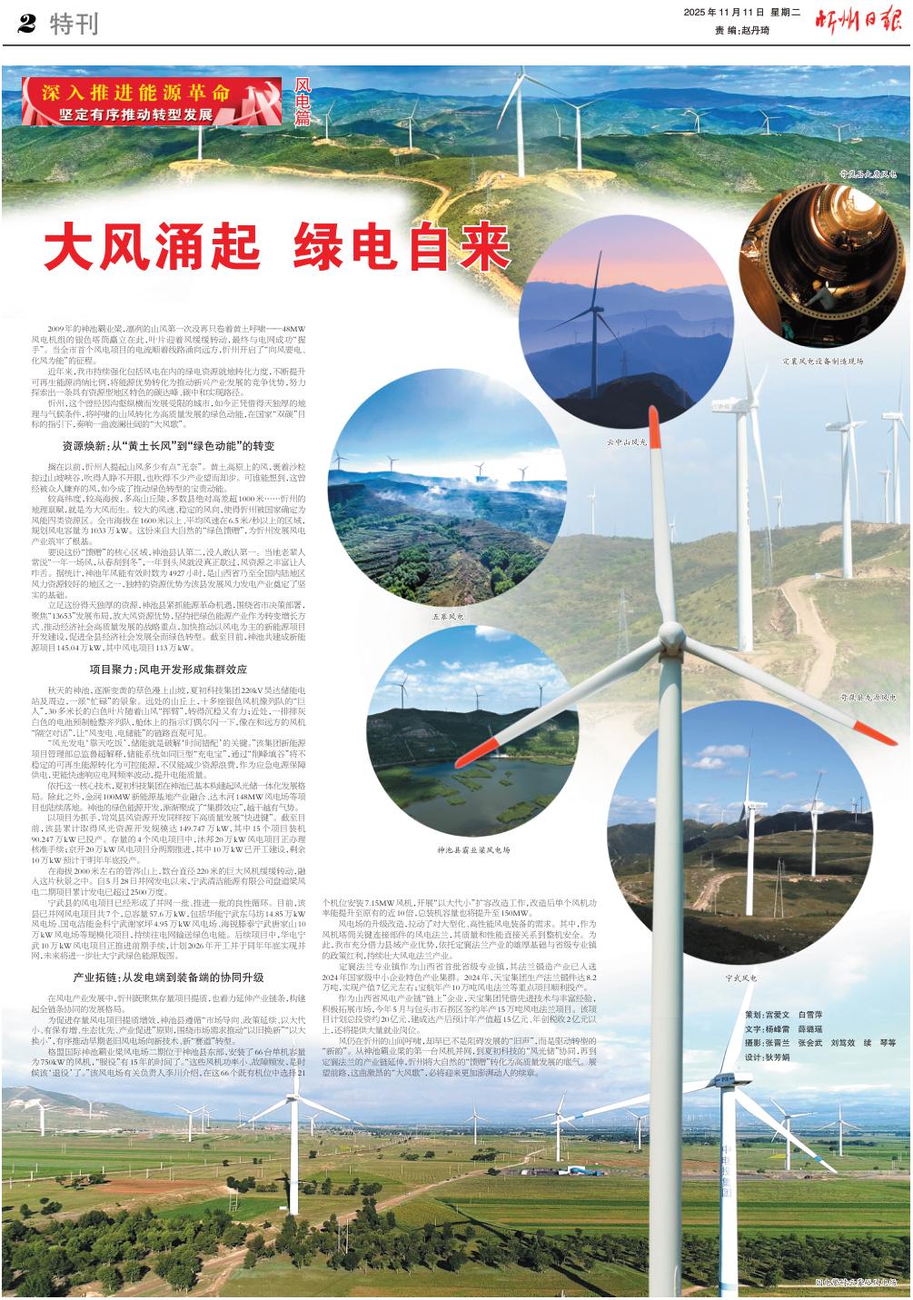 寧武縣的風(fēng)電項(xiàng)目已經(jīng)形成了并網(wǎng)一批、推進(jìn)一批的良性循環(huán)。目前,該縣已并網(wǎng)風(fēng)電項(xiàng)目共7個(gè),總?cè)萘?7.6萬(wàn)kW,包括華能寧武東馬坊14.85萬(wàn)kW風(fēng)電場(chǎng)、國(guó)電潔能金科寧武謝家坪4.95萬(wàn)kW風(fēng)電場(chǎng)、海銳滕泰寧武唐家山10萬(wàn)kW風(fēng)電場(chǎng)等規(guī)?;?xiàng)目,持續(xù)往電網(wǎng)輸送綠色電能。后續(xù)項(xiàng)目中,華電寧武10萬(wàn)kW風(fēng)電項(xiàng)目正推進(jìn)前期手續(xù),計(jì)劃2026年開(kāi)工并于同年年底實(shí)現(xiàn)并網(wǎng),未來(lái)將進(jìn)一步壯大寧武綠色能源版圖。