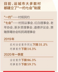 目前,運城市大多數(shù)村都建立了“一約七會”制度——“一約”是村規(guī)民約,“七會”是村民議事會、紅白理事會、老年協(xié)會、新鄉(xiāng)賢理事會、道德評議會、禁賭禁毒協(xié)會和民調(diào)理事會。這“一約七會”制度的不斷健全,對破除鄉(xiāng)村社會陋習(xí)、引導(dǎo)群眾移風(fēng)易俗、引領(lǐng)社會新風(fēng)、化解矛盾糾紛,維護(hù)基層社會和諧穩(wěn)定起到了重要作用。村民的正能量多了,鄉(xiāng)村的負(fù)面事情少了,社會治安狀況得到明顯改善,群眾安全感顯著增強(qiáng)。2019年運城市農(nóng)村治安案件同比下降31.2%,刑事案件下降14.3%;2020年一季度,治安案件下降86.3%,刑事案件下降59.7%。