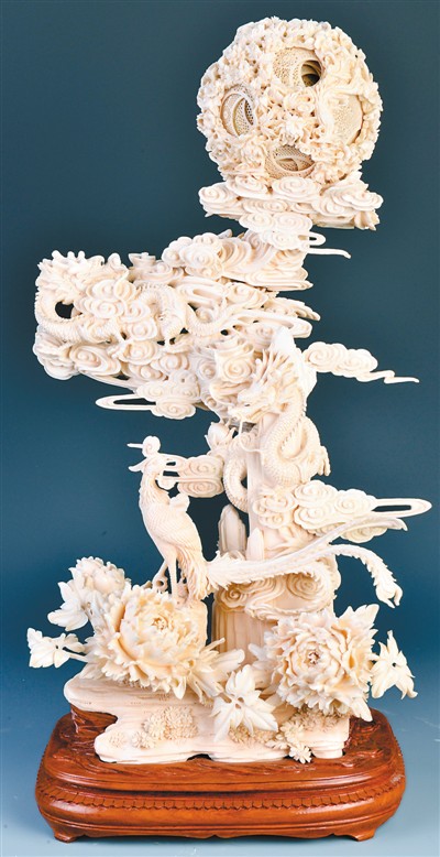 象牙球旁邊放著象牙微雕工藝創(chuàng)始人馮公俠雕刻的屈原《九歌》。拇指大的小座屏上刻有1700余字,肉眼看是密密麻麻的黑點,置于放大鏡下,可以看見每個字筆畫清晰工整。