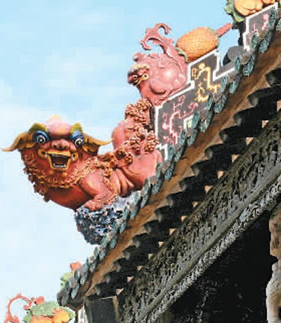 “三雕兩塑”(石雕、木雕、磚雕、陶塑、灰塑)是嶺南傳統(tǒng)建筑常用構件。陳家祠建筑屋頂上裝飾著層疊錯落、精致繁復的陶塑和灰塑,堪稱一大亮點。曾翔介紹,最頂層的陶塑瓦脊就是著名的“石灣陶”,在廣東佛山石灣鎮(zhèn)燒制而成,內容一般以粵劇故事、花卉和吉祥圖案為主。瓦脊下方的基座是灰塑?;宜艿闹谱鞴に嚤容^特別,用石灰摻入糖膠、稻草、糯米等混合發(fā)酵后,往房頂?shù)你~鐵骨架上填抹塑形,再涂上顏色?;宜軟]有經過高溫燒制,容易受風雨侵蝕而剝落掉色,每隔五六年就要進行保養(yǎng)修復。