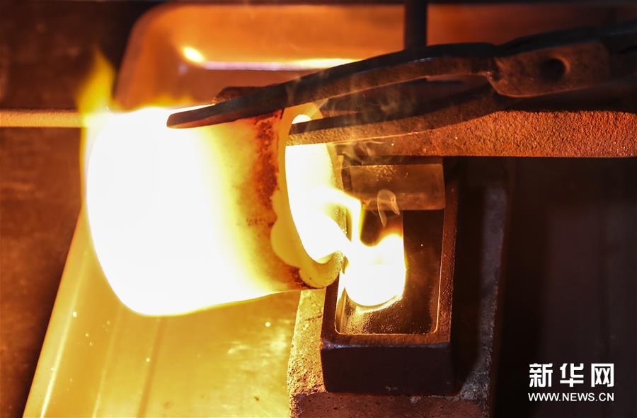 在南京金線金箔總廠,工人將熔化的金水倒入容器(2019年12月12日攝)。68歲的王必生是江蘇南京人,1973年進(jìn)入南京金箔鍛制技藝項目保護(hù)單位——南京金線金箔總廠,師從老藝人譚柱石,他虛心學(xué)習(xí),潛心鉆研,很快掌握打金箔的技藝。他致力于技術(shù)革新和改造,參與機(jī)械打箔機(jī)、自動打箔機(jī)的研制。2009年他被評為國家級非物質(zhì)文化遺產(chǎn)項目南京金箔鍛制技藝代表性傳承人。 金箔鍛制技藝,俗稱“打金箔”,歷史悠久。在南京一些地方,金箔生產(chǎn)仍然延用古代傳下的制作工序,鍛制過程包括化金條、拍葉、做捻子、沾捻子、打開子、裝開子、出具、切箔等。 金箔廣泛應(yīng)用于建筑裝飾,還可應(yīng)用于雕塑、工藝品、書畫、食品藥品、服飾等方面的貼金裝飾和制作。南京金箔品種有真金箔、銅箔、銀箔、鋁箔,薄如蟬翼、色澤純正、厚薄均勻,產(chǎn)品銷往海內(nèi)外。 目前,王必生所在的南京金線金箔總廠是國家級非物質(zhì)文化遺產(chǎn)代表性項目保護(hù)單位。工廠把人工打金箔的遺址保護(hù)起來,并成立了金箔大師工作室,加強(qiáng)金箔技藝的推廣,加大傳承人的培養(yǎng)力度。已經(jīng)退休的王必生被工廠返聘,負(fù)責(zé)打箔技藝展示和傳承。他說,現(xiàn)在機(jī)器打箔越來越多,但人工打出的金箔的更加柔軟,齊整。他希望這一傳統(tǒng)技藝能夠繼續(xù)傳承下去。新華社記者 楊磊 攝