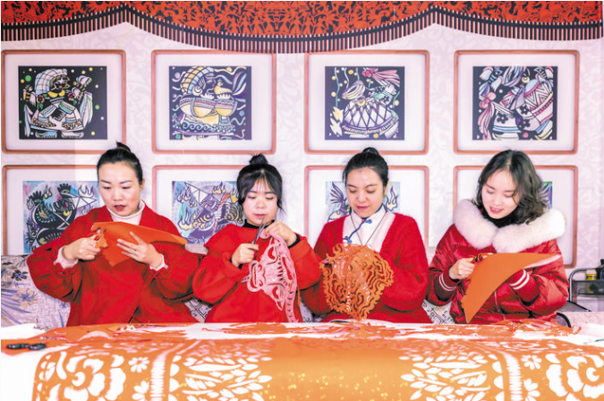 1月17日,岳紅霞(右二)帶領(lǐng)工作室學(xué)員創(chuàng)作“金牛送?!奔艏垺=眨@全國剪紙大賽“金剪刀獎”、貴州省畢節(jié)市黔西縣非遺傳承人岳紅霞帶領(lǐng)工作室學(xué)員創(chuàng)作“金牛送福”系列主題作品,迎接農(nóng)歷牛年。 (新華社發(fā) 范暉 攝)