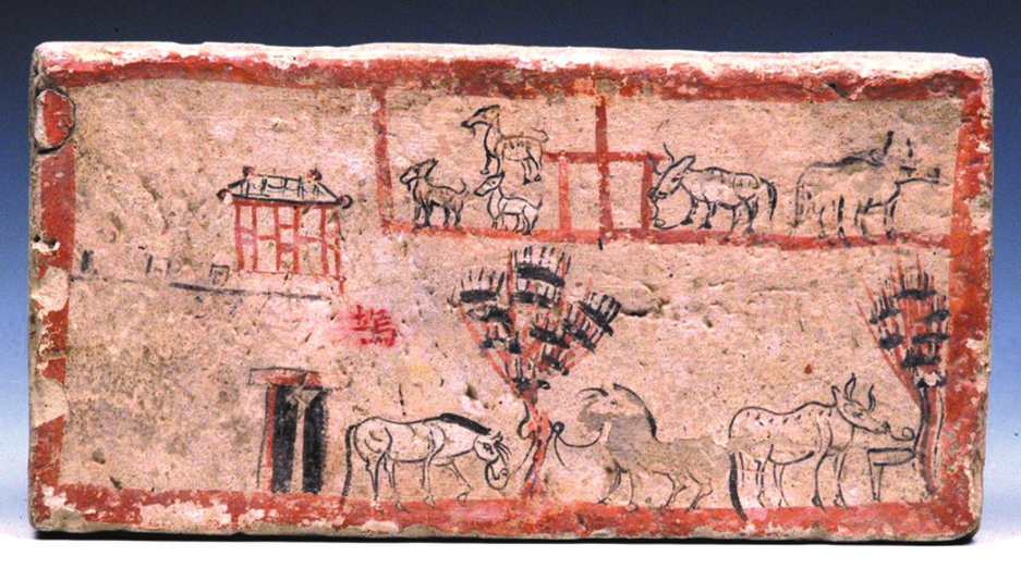 塢壁是東漢時(shí)期極具特色的建筑,由于當(dāng)時(shí)地方豪強(qiáng)勢(shì)力急速發(fā)展,廣泛兼并土地,蔭庇宗族與賓客,形成自己的武裝與生產(chǎn)力量,逐漸出現(xiàn)了塢、屯、壁、堡、壘、營(yíng)、寨等集生產(chǎn)、生活、軍事為一體的建筑,閉門成市,后來(lái)在魏晉時(shí)期發(fā)揚(yáng)光大。嘉峪關(guān)長(zhǎng)城博物館藏的一塊畫像磚,磚面左側(cè)繪一小城,城墻上筑雉堞,城門上建譙樓,榜題“塢”字,塢外繪有兩株樹,還有一群牛馬羊在悠閑吃草,形象再現(xiàn)了塢的建筑形制。