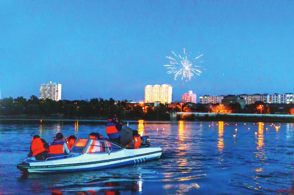 夜幕降臨,一盞盞寄予了人們美好祈愿的蓮花燈被緩緩放入黃河水中,星星點點的燈火在暗夜中飄向遠(yuǎn)處。一時間,河中水映燈影,燈耀波光,河面上忽明忽滅的河燈與空中的焰火交相輝映,寄托了人們美好的愿望,傳遞著延續(xù)數(shù)百年的祝福。