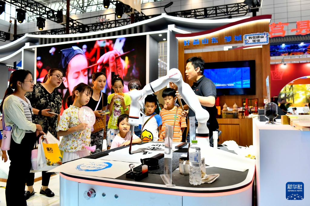 9月16日,在山東國際會(huì)展中心,來自濟(jì)寧市的參會(huì)人員在展示機(jī)器人書寫漢字。