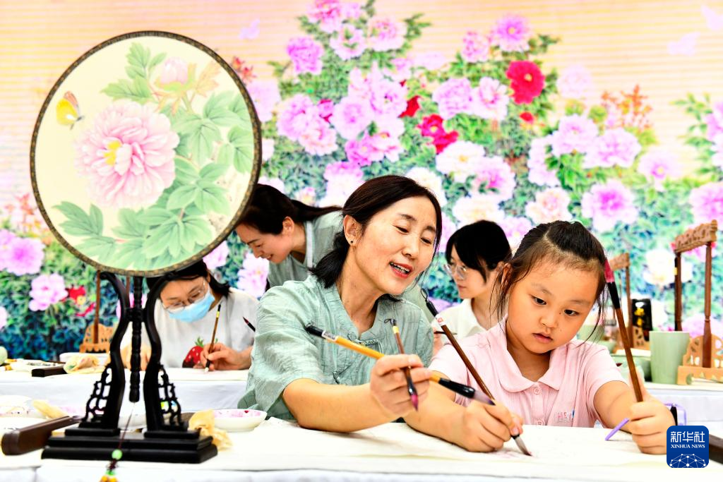 9月16日,在山東國際會(huì)展中心,來自巨野書畫院的藝術(shù)工作者姚愛紅教孩子給工筆牡丹畫上色。
