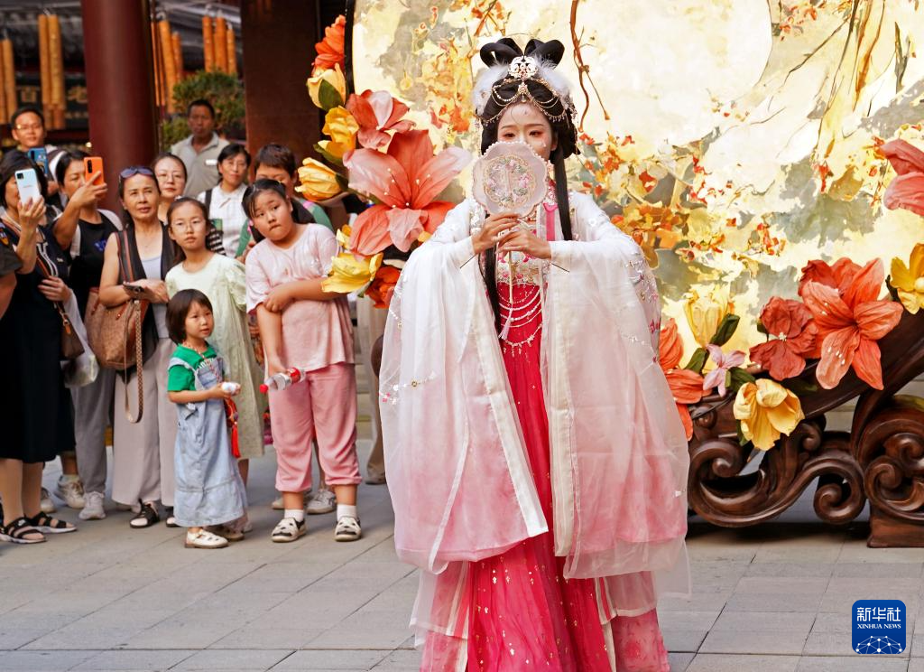 當(dāng)日,作為“2023上海旅游節(jié)”系列活動之一,豫園商城2023“仲秋月神游”活動正式啟幕。即日起至9月28日,游客可在中秋主題的互動場景中,游園賞月,欣賞演出,參與互動,共賞古風(fēng)佳節(jié)浪漫,共享傳統(tǒng)文化之美。新華社記者 劉穎 攝