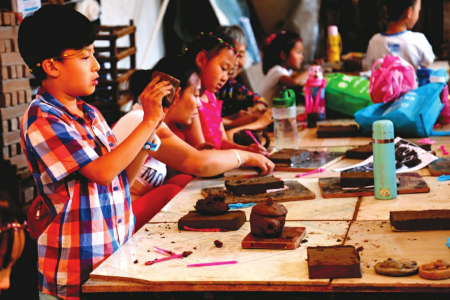 小學(xué)生在晉派磚雕傳習(xí)所學(xué)習(xí)傳拓技藝。