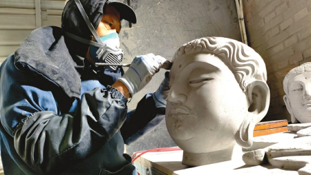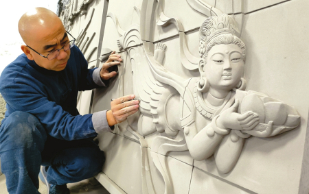 11月22日,晉中市太谷區(qū)晉派磚雕研究所,省級(jí)非遺項(xiàng)目晉派磚雕代表性傳承人溫建明正在為《飛天》磚雕作品進(jìn)行最后的創(chuàng)作。