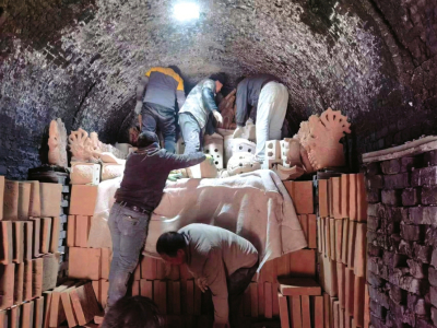 工人將制作好的磚雕坯子裝進(jìn)火窯準(zhǔn)備烘烤。