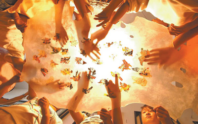 非遺傳承人給學(xué)生展示傳統(tǒng)皮影。張建益 攝