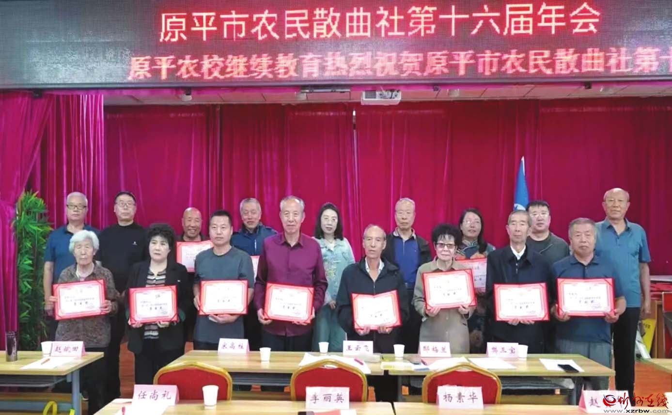 散曲社朗誦部的曲友們在悠揚音樂聲中,激情澎湃地朗誦著五谷飄香的農(nóng)民散曲,20多名優(yōu)秀社員受到表彰,展示出原平農(nóng)民散曲的喜慶豐收景象?!霸娙绯?,農(nóng)民種曲名聲在,情如火,南腔北調(diào)心澎湃。曲如海,同舟共濟承傳愛,暖如春,一年四季花不敗?;ㄩ_滿地鮮,曲韻熔天籟,好一個震驚曲界田園派?!边@首散曲《正宮·塞鴻秋》道出了散曲社社員們的心聲。
