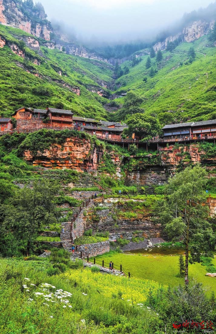 基巖構(gòu)造、河谷沖擊、垂直生態(tài)、冷涼氣候……有別于他處的雋永靈秀,寧武之境實(shí)乃神來之筆。懸空村位于寧武縣管涔山深處,現(xiàn)為蘆芽山風(fēng)景區(qū)的一個景點(diǎn),因村莊懸于峭壁之上而稱奇。村里多以石頭和木材建房,村中唯一道路是由圓木搭起的空中棧道,行于其上,猶如走在半空,從崖底仰望,似空中樓閣,故而得名。
