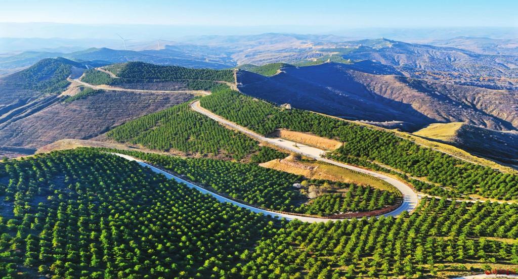 邊塞重地,長年征戰(zhàn),風(fēng)沙肆虐,溝壑縱橫。特殊的地理位置和惡劣的氣候條件,導(dǎo)致偏關(guān)的原始植被幾近絕跡。偏關(guān)人一年中有半年在植樹造林,人工搬苗,人工運(yùn)水,從山下到山上,再從山上到山下,來回往返,汗水淌過春夏秋冬,足跡踏遍山嶺圪梁。為減少水土流失,他們?cè)谏狡律贤诮诲e(cuò)排列的魚鱗坑,以貯存“貴如油”的雨水,為油松提供有限的囊盡天地之饋贈(zèng)的水肥。淺淺的土層,種不下高頭大樹,僅能讓幾十厘米的油松保持直立。偏關(guān)人誓將“荒山”變“綠山”,“換書記不換主意,換縣長不換主張”“一任接著一任干,一級(jí)干給一級(jí)看”……以堅(jiān)韌之力重塑山河、治理生態(tài),以愚公之力見縫插綠、逢山播綠,以“饅頭加镢頭、燴菜加會(huì)戰(zhàn)”的不屈精神,年年歲歲,綠色接力,將偏關(guān)打造成全省生態(tài)建設(shè)紅旗縣,黃河流域生態(tài)文明建設(shè)先進(jìn)縣,在不毛之地寫下綠色詩行,筑起綠色長城。