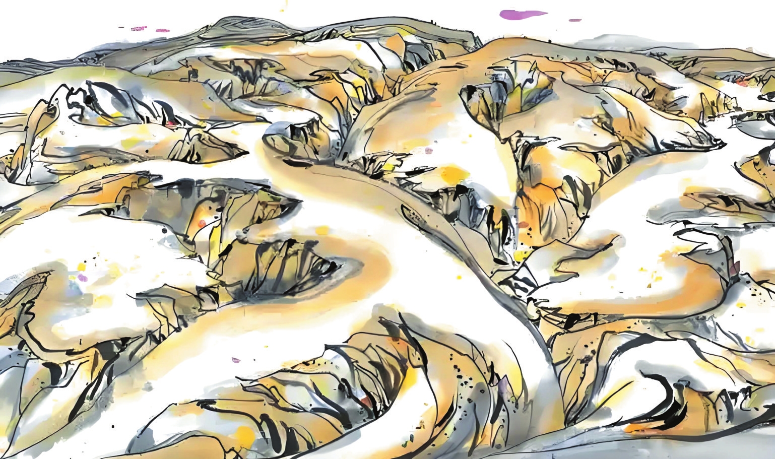 1989年10月的河曲寫生,是吳冠中藝術(shù)生涯的重要轉(zhuǎn)折點。在陪同的學(xué)生王秦生引導(dǎo)下,這位古稀老人尋找“黃土荒漠之典型地區(qū)”,最終駐足晉西北河曲縣。每日晨起,他面對被雨水沖刷、滿山皆溝壑的地貌,靜心思考,猛然產(chǎn)生了驚人的藝術(shù)聯(lián)想——起伏的山形如同眾多老虎,而那些溝壑恰似老虎皮毛上的斑紋。他在《出現(xiàn)老虎》一文中寫道:“我終于發(fā)現(xiàn)黃土高原是展拓了的老虎之群,其間伏臥著無數(shù)猛虎,有的正將躍起,有的還在酣睡。作完數(shù)幅黃土高原,意猶未盡,于是我畫起老虎來。”這種將地理特征轉(zhuǎn)化為藝術(shù)創(chuàng)作標(biāo)志著吳冠中完成“從風(fēng)景寫生到精神寫意”的蛻變,其價值在于為現(xiàn)代中國畫開辟了根植本土、融貫中西的新路徑。一個月河曲翠峰山寫生之旅誕生的《老虎高原》,更以極富樂感的線條勾勒出這片土地精神的圖騰。