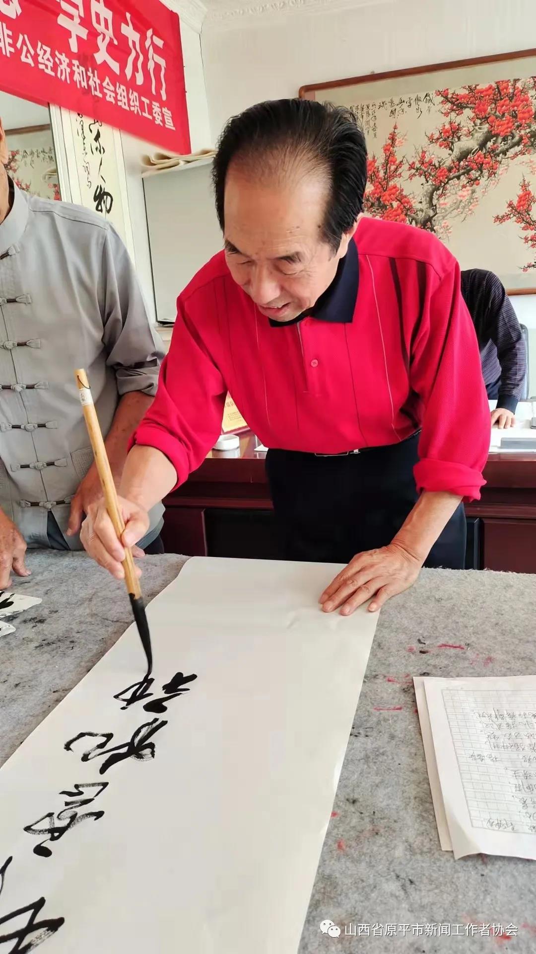活動(dòng)現(xiàn)場,大家暢所欲言,紛紛聯(lián)系思想實(shí)際,交流了學(xué)習(xí)黨史、明理知進(jìn)的心得體會(huì),圍繞學(xué)史長知、學(xué)史明理、學(xué)史增信、學(xué)史興業(yè)進(jìn)行了熱烈討論。接著,書畫藝術(shù)組的書法家亢銀中、趙存仁、王玉伍、張正山、王福歲、王弘新,及學(xué)會(huì)顧問書畫名家溫樹森老師、以及特邀書畫名家李晉復(fù)先生,紛紛揮毫潑墨,書寫出學(xué)習(xí)黨史的感悟與名言。大筆揮灑中,一幅幅寫有“賡續(xù)精神血脈、傳承紅色基因”“明理增信.崇德力行”“不忘初心、牢記使命”和“江山就是人民、人民就是江山”等字樣的真、草、隸、篆、行書藝作品,從筆下飄然而出。墨香中呈現(xiàn)出各有千秋、韻味感人的風(fēng)格,博得觀賞者們的點(diǎn)贊稱道,并爭相拿到一幅贈(zèng)品。書法家們顧不上喝水,整整忙了一個(gè)上午。特別是書畫藝術(shù)組組長李文光,由于平時(shí)在廣州忙于接送孩子上學(xué),放暑假回原平后特地趕來,高興地跟大家一起切磋書藝、展示才藝。書法家們還探討了書法藝術(shù)融入社會(huì)、融入黨性、服務(wù)大眾、服務(wù)中心的蹊徑、舉措與打算。(賈宣生 王福歲)