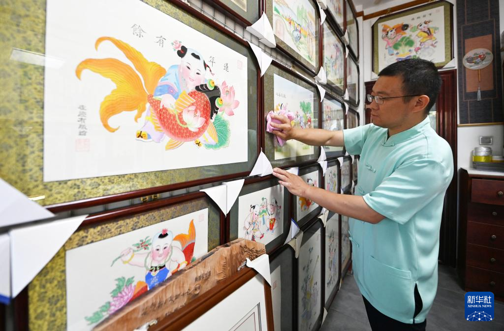 在天津市西青區(qū)的楊柳青霍氏古一張畫店,霍樹林在用布擦拭畫框(6月6日攝)。