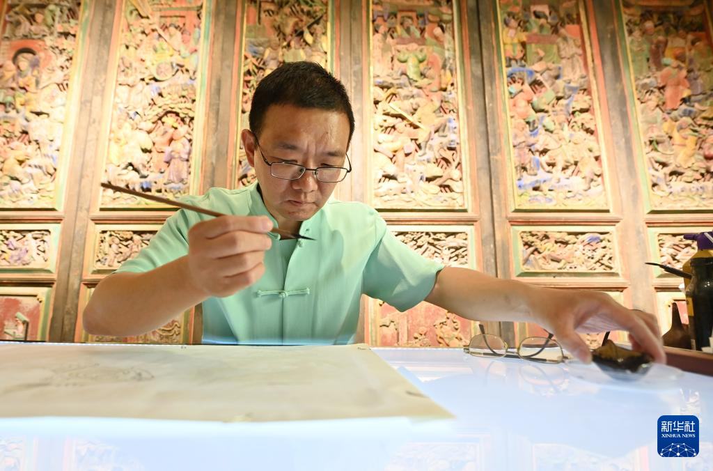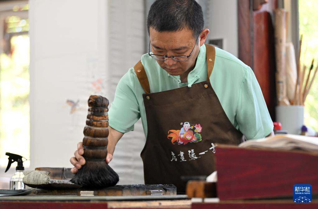 霍樹林在天津市西青區(qū)的楊柳青霍氏古一張畫店進(jìn)行刷墨(6月6日攝)。