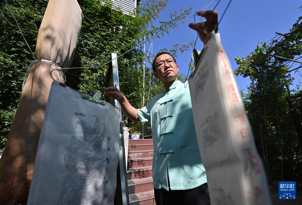 在天津市西青區(qū)的楊柳青霍氏古一張畫店,霍樹林把印好的“畫坯子”進(jìn)行晾曬(6月6日攝)。