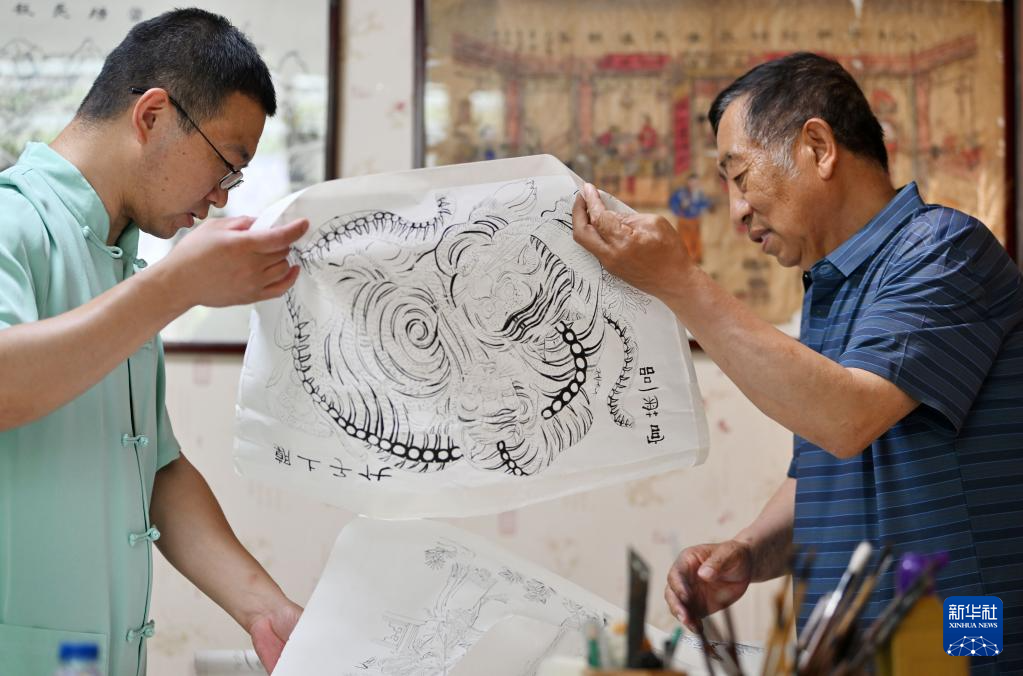 在天津市西青區(qū)的楊柳青霍氏古一張畫店,霍樹林(左)和父親霍慶有交流下一階段的年畫制作(6月6日攝)。