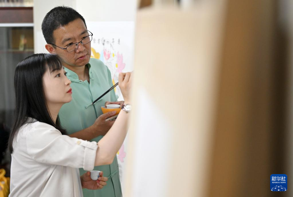 在天津市西青區(qū)的楊柳青霍氏古一張畫店,霍樹林(右)和妻子王丹一起進(jìn)行彩繪(6月6日攝)。