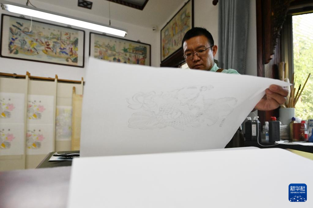 霍樹林在天津市西青區(qū)的楊柳青霍氏古一張畫店準(zhǔn)備進(jìn)行勾線(6月6日攝)。