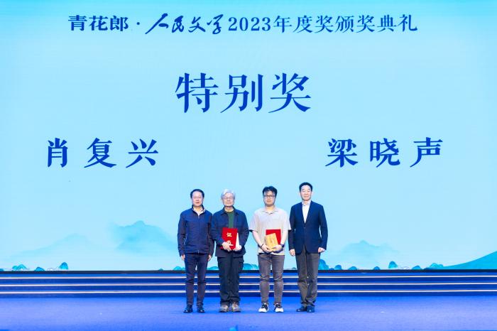 著名作家肖復興、梁曉聲獲得本屆“人民文學獎”特別獎,梁曉聲小說責任編輯梁豪代為領獎。圖片來源:主辦方供圖