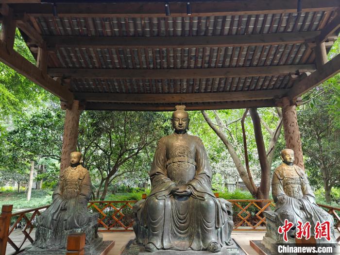 在四川博物院,“長(zhǎng)江之神”戶(hù)外常設(shè)展迎來(lái)大批觀眾?,F(xiàn)場(chǎng)立有明代江瀆神青銅像,鑄造工藝精美,青銅像身上的銘文記載了鑄造起因和有關(guān)江瀆祠建造的記錄。