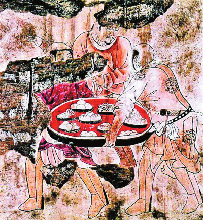 如今的主食豐富多樣,不僅包括面條、餃子、餛飩、米粉等面制品,還有以玉米、小米等雜糧為代表的粗糧制品。其實(shí),宋代已形成中國人主食的雛形,《東京夢華錄》載:“凡餅店,有油餅店,有胡餅店。若油餅店,即賣蒸餅、糖餅、裝合、引盤之類。胡餅店即賣門油、菊花、寬焦、側(cè)厚、油碢、髓餅、新樣滿麻。每案用三五人捍劑卓花入爐?!薄罢麸灐奔创讹灒把b合”即盒裝的餅,“引盤”是盛于盤中的食品,“捍劑卓花”意思是把面團(tuán)先分成大小相近的劑子,再分別搟開成餅,最后捏出花樣。