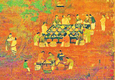 宋代面食既有團(tuán)子狀、面疙瘩狀的,也有薄片狀、條狀的,前者可以用湯匙吃,后者多用筷子吃。此外,《東京夢華錄》中還詳細(xì)介紹了宋代餐廳的外觀、菜肴及客人點(diǎn)菜方法:“每店各有廳院東西廊,稱呼坐次??妥?,則一人執(zhí)箸紙,遍問坐客。”大意是說,每家店都有廳堂、庭院、東西廊,待客人落座,店家便送上筷子、紙花,詢問客人要吃些什么。