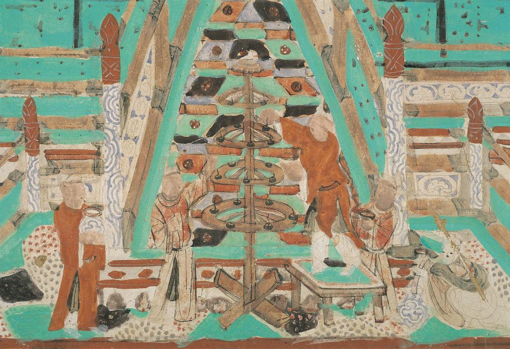 花好月圓夜,人們擺設香案、放置供品,敬奉月神。敦煌研究院介紹,在莫高窟第103窟的壁畫中,描繪了古人們頭頂明月、圍繞寶塔祭拜的場景。