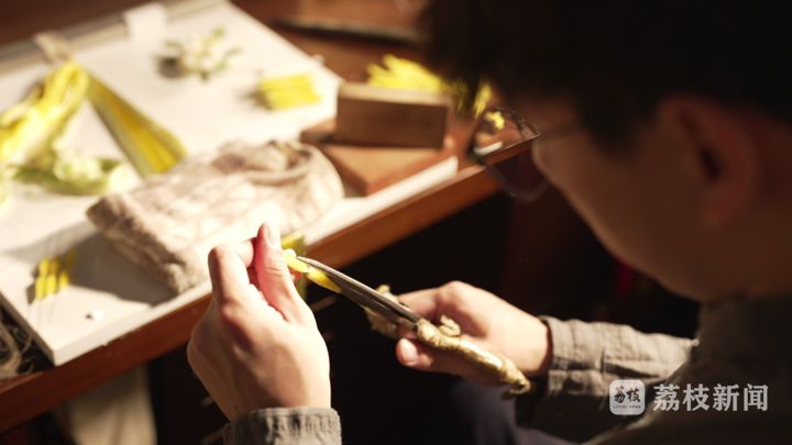 盡管對初學者來說,每一個步驟都有不同的難點,但最讓嚴鑫記憶猶新的還是打尖留下的疼痛?!按蚣饩褪菍⒔q條修剪成需要的形狀,需要左右手的配合,右手拿剪刀,左手的食指和拇指進行捻轉(zhuǎn)。一天的工作當中我們基本上大部分時間都是在做這個過程。剛開始學的時候晚上睡覺都會疼醒,左手的食指都沒有辦法完全彎曲下去?!?/p>