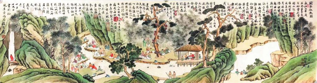 東晉永和九年(353年)上巳節(jié),會(huì)稽內(nèi)史王羲之和謝安、孫綽等人在山陰蘭亭修禊,曲水流觴,飲酒賦詩(shī),所作詩(shī)歌后來(lái)結(jié)集為《蘭亭集》,王羲之為之撰序,即被稱作“天下第一行書(shū)”的《蘭亭序》,而蘭亭雅集的詩(shī)酒風(fēng)流也成為千古佳話。在后世仿效的各類蘭亭雅集中,詩(shī)歌、繪畫(huà)、書(shū)法等多種藝術(shù)元素爭(zhēng)奇斗艷,形成華麗精致、傳承千載的文化景觀。